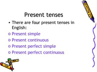 This document discusses the four present tenses in English: present simple, present continuous, present perfect simple, and present perfect continuous. It provides examples and explanations of when to use each tense, such as using the present simple to talk about habits, permanent situations, or future events on a calendar. The present continuous is used for activities happening now or temporary situations. The present perfect simple is used for unfinished activities continuing up to the present or recently finished activities. The present perfect continuous is used for longer unfinished or recently finished activities or repeated actions continuing up to the present.