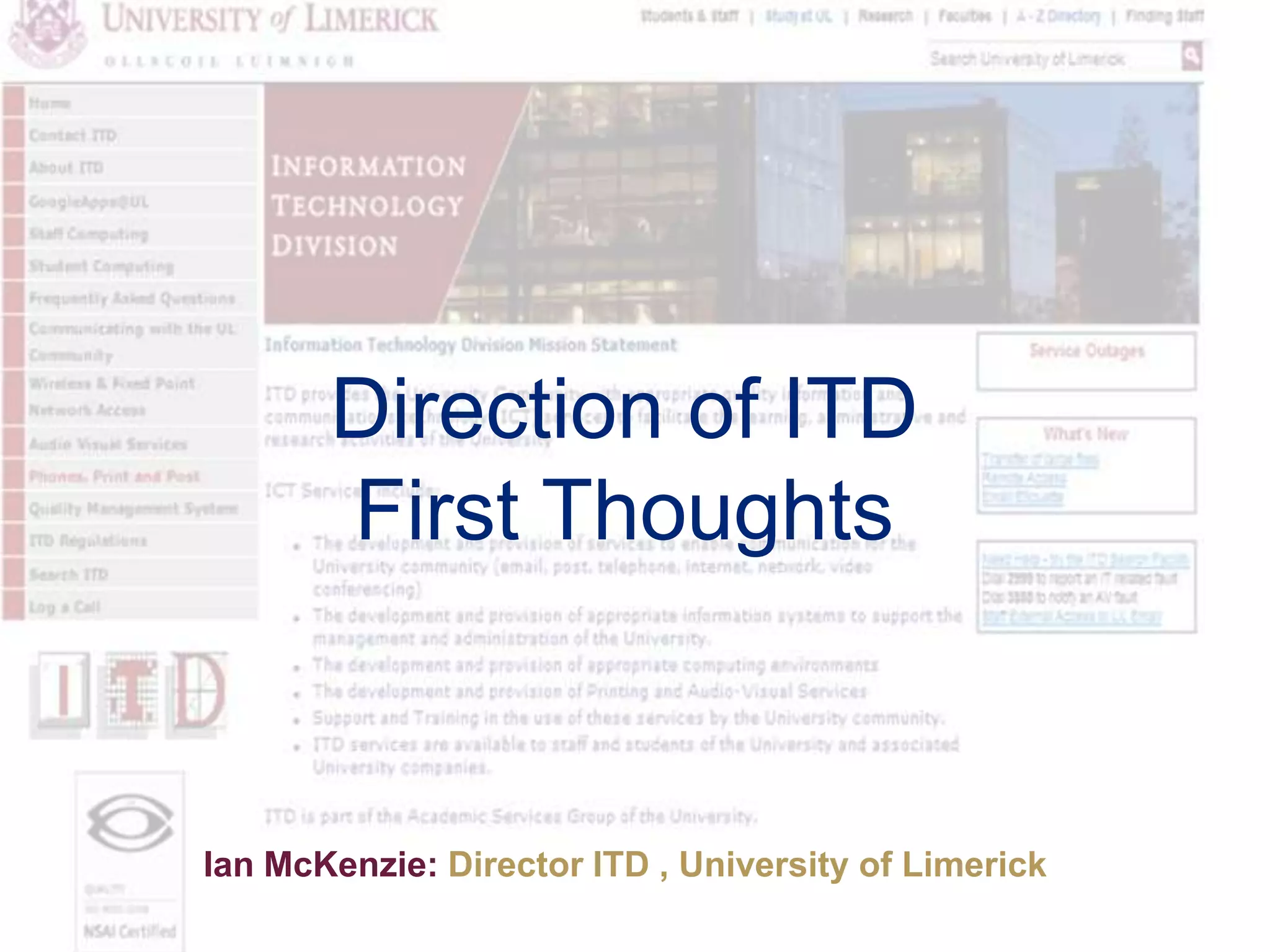 Ian McKenzie, the Director of ITD at the University of Limerick, outlines 11 directions for ITD to improve its governance, operations, and services. These include implementing a strategic plan aligned with ISO standards, a formal project management framework, improved procurement processes, enhancing support for teaching/learning and research, developing an IT architecture replacement plan, building business process reengineering capabilities, establishing a disaster recovery site, and increasing collaboration across Irish university IT departments. The goals are to engage stakeholders, standardize processes, facilitate sharing of best practices, and support the university's strategic objectives.
