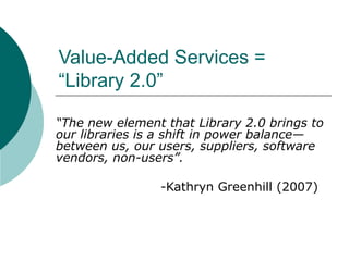 The document discusses value-added services and Library 2.0 in academic libraries. It argues that libraries must embrace new technologies like wikis, blogs, social media, tagging and mashups to remain relevant to users. Libraries need to shift to a more user-centered model, inviting participation and collaboration. This will allow libraries to better serve users and reach new audiences.