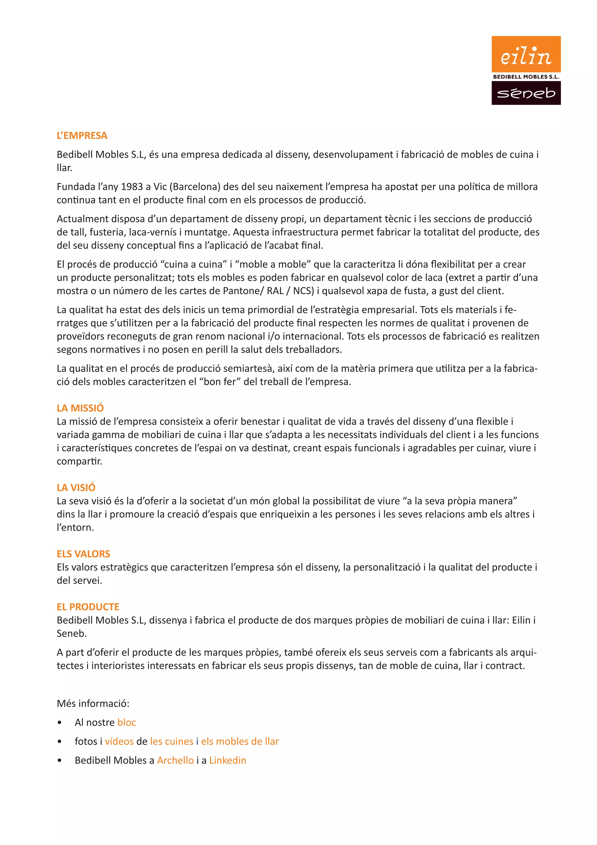 Bedibell Mobles S.L, dissenya i fabrica el producte de dos marques pròpies de mobiliari de cuina i llar: Eilin i