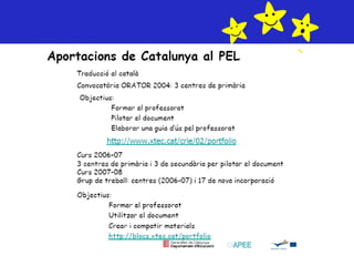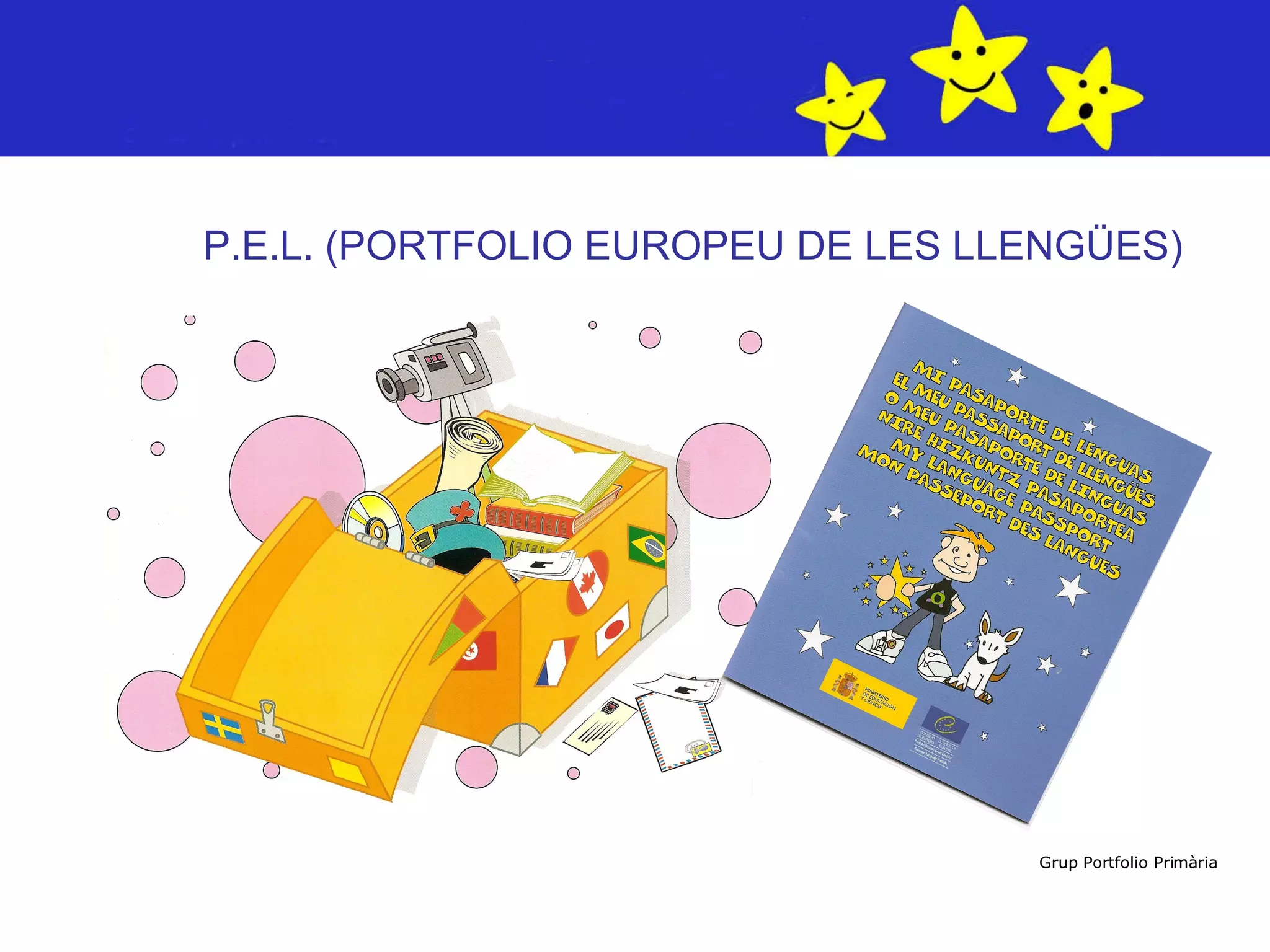 PEL Eina mediadoraentre marc comú de referència i els aprenents Divisió de llengües del consell d’Europa Aprenentatge actiu i penetració de l’autoregulació Funció pedagògica Funció informativa El meu dossier La meva biografia lingüística El meu passaport de llengües Poster, carta, postal, dibuix, poema, etc. Fomentar un E/A més reflexiu Precisar els objectius d’aprenentatge en temes comunicatius Afavorir l’autoevaluació en la identificació de les competències adquirides Fomentar un canvi educatiu més centrat en l’alumne/a Proposar un llenguatge comú entre els ensenyaments europeus Utilitzar la descripció de les competències lingüístiques del Marc Europeu Comú de Referència Recull de documents que ilustren l’aprenentatge de llengües de l’alumne El nivell de les 5 competències lingüístiques que te l’alumne Fou creat per Dissenyat per Permet Inclou 3 components Fa referència L’aprenent reflexioni sobre el seu aprenentatge els seus objectius són mostra és Com per exemple Té com a objectiu