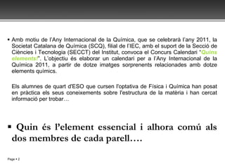 Amb motiu del’Any Internacional de la Química, que se celebrarà l’any 2011, la Societat Catalana de Química (SCQ), filial de l’IEC, amb el suport de la Secció de Ciències i Tecnologia (SECCT) del Institut, convoca el Concurs Calendari “ Quins elements! ”. L’objectiu és elaborar un calendari per a l’Any Internacional de la Química 2011, a partir de dotze imatges sorprenents relacionades amb dotze elements químics. Els alumnes de quart d'ESO que cursen l'optativa de Física i Química han posat en pràctica els seus coneixements sobre l'estructura de la matèria i han cercat informació per trobar… Quin és l’element essencial i alhora comú als dos membres de cada parell….