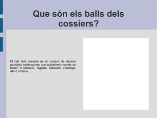 Que són elsballs dels cossiers? El ball dels cossiers es un conjunt de danses populars mallorquines que actualment només es ballen a Montuïri, Algaida, Manacor, Pollença, Alaró i Palma.