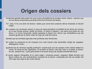 Origen dels cossiersCertament gairebé sols podem dir que la seva procedència és d’origen remot, obscur, i ignorat, que és una dansa antiquíssima perduda dintre de la foscúria del temps. Tot i això, hi ha una sèrie de factors i dades que convé tenir presents alhora d’estudiar el discutit origen. Els cossiers van començar essent un tipus de ritual permillorar la fertilitat de les terres de conrreu en el que homes anaven vestits de dones. Hi havia 6 cossiers i una dama que podia ser una dona o un home transvestit, també apareixia la figura d'un dimoni que simbolitzava que els cossiers guiats per la dama volien fer fugir els mals de la terra. Sembla que les divinitats agrícoles més primitives eren femenines. És evident la presència en els Cossiers d’un molt marcat culte dendrolàtic (dirigit als vegetals), alfabeguera, murta... Igualment és de remarcar aquella purificació i preservació que els cossiers volen obtenir ballant en cercle. El cercle és ben significatiu. Hi envolten la Dama i sols ella l’obre o el desfà; el dimoni, és clar, sempre fora, i quan gosa entrar-hi és aviat vençut per aquella divinitat feta dona. El cercle, segons l’etnografia, té un caire màgic i comporta puresa i resguard. Ballar formant una figura rodona és una característica universal de la dansa i practicada per tots els pobles del món sigui quin sigui el seu nivell cultural.