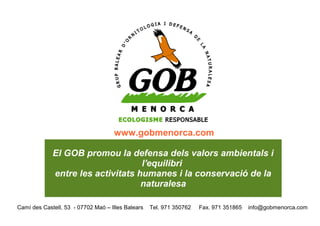 Camí des Castell, 53 - 07702 Maó – Illes Balears Tel. 971 350762 Fax. 971 351865 info@gobmenorca.com