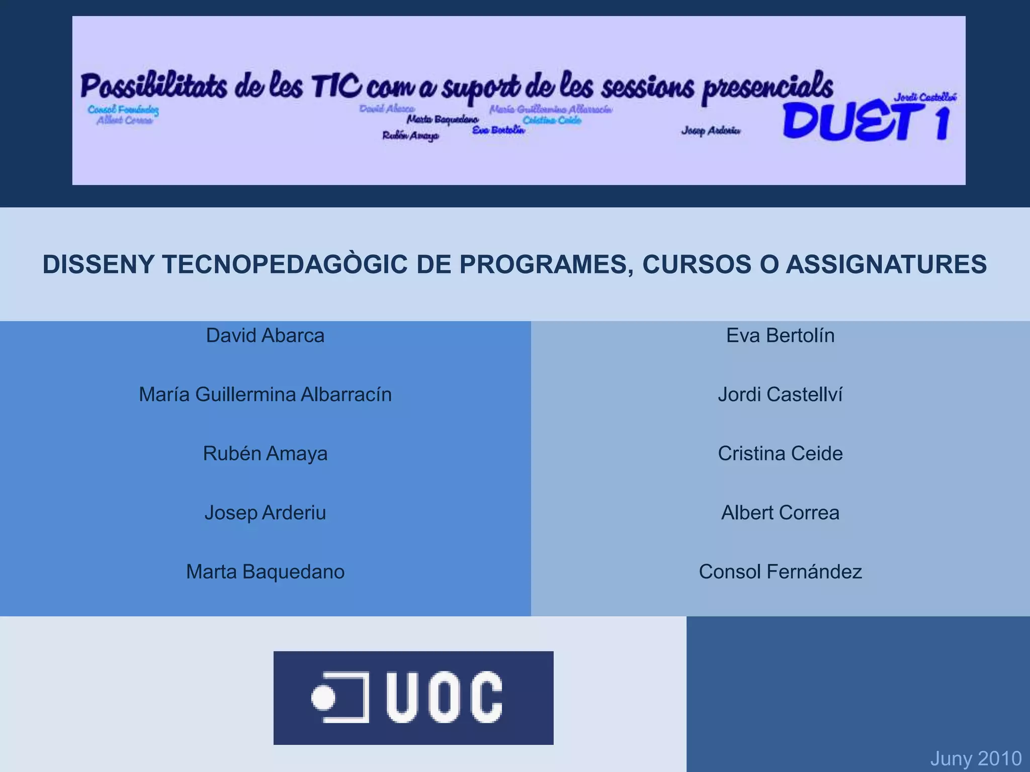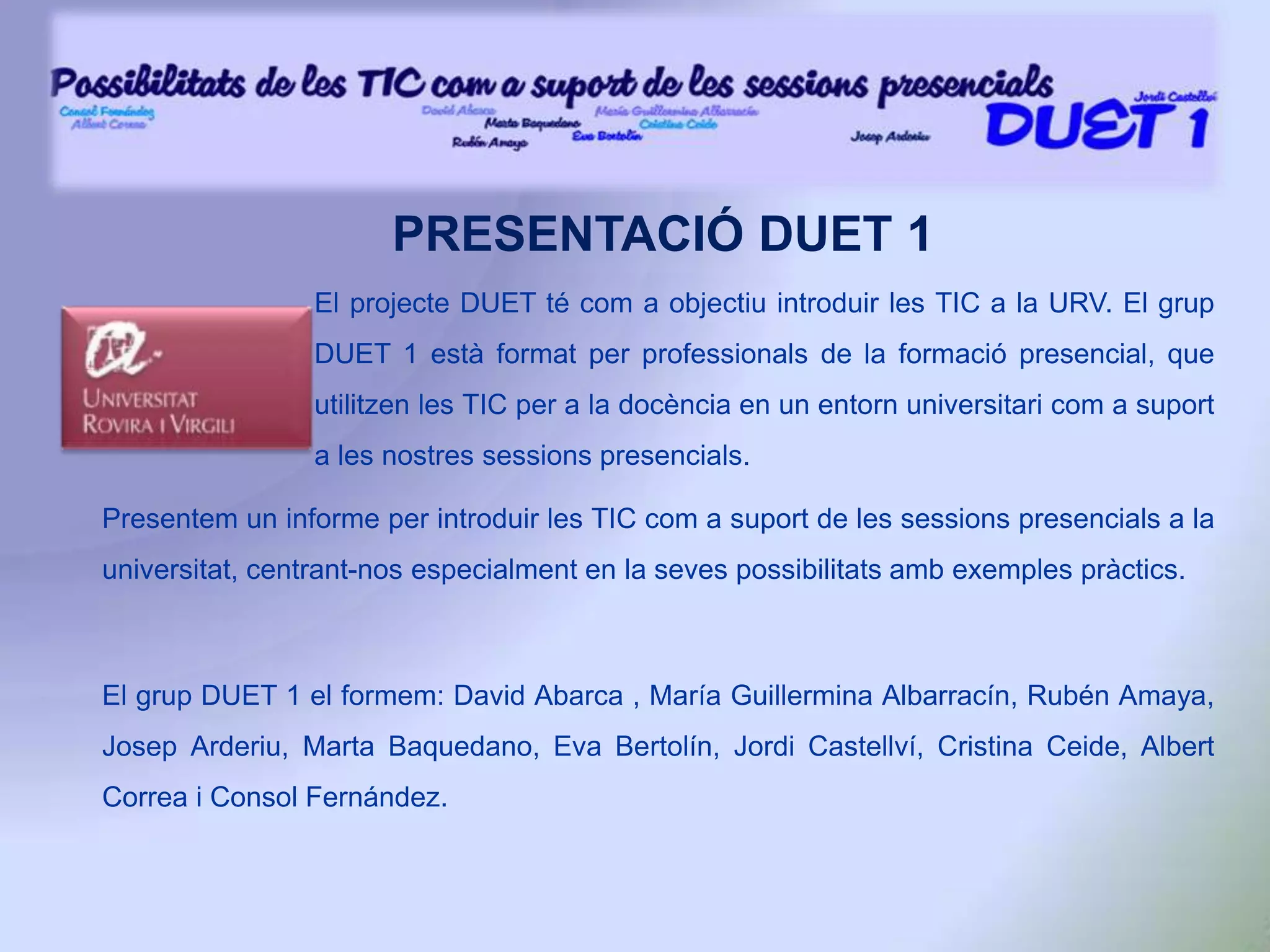 PRESENTACIÓDUET 1El projecteDUET té com a objectiu introduir les TIC a la URV. El grup DUET 1 està format per professionals de la formació presencial, que utilitzen les TIC per a la docència en un entorn universitari com a suport a les nostres sessions presencials.Presentem un informe per introduir les TIC com a suport de les sessions presencials a la universitat, centrant-nos especialment en la seves possibilitats amb exemples pràctics.El grup DUET 1 el formem: David Abarca , María Guillermina Albarracín, Rubén Amaya, Josep Arderiu, Marta Baquedano, Eva Bertolín, Jordi Castellví, Cristina Ceide, Albert Correa i Consol Fernández.