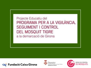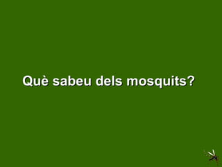 Presentació Mosquit Tigre 1. 2. 3. 4. 5. 6. 7. 8. 9. 10. 11. 12. Qui és el Mosquit Tigre? Aedes albopictus – mosquit tigre 13. 14. 15. Amb qui no l’hem de confondre? Sirfid Típula Culiseta Mosquit comú 16. Per què ens preocupa? Ens pica Fa mal Pica a ple dia És molt agressiu Pot portar malalties 17. 18. 19. 20. 21. 22. 23. Què podem fer? Evitar llocs on s’acumulin petites quantitats d’aigua... ...així no podrà criar. 24. 25. 26. 27. 28. 29. 30. 31. 32. 33. 34. 35. 36. 37. 38. 39. Per què ens preocupa? Perquè conviu amb nosaltres Sobretot en llocs amb cases amb jardí Sol criar en llocs privats on no s’hi pot entrar Utilitza recipients abandonats per reproduir-se