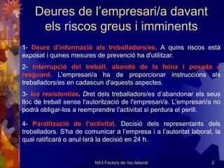 Deures de l’empresari/adavant els riscos greus i imminents 1- Deure d’informació als treballadors/es . A quins riscos està exposat i quines mesures de prevenció ha d'utilitzar. 2- Interrupció del treball, abandó de la feina i posada a resguard. L'empresari/a ha de proporcionar instruccions als treballadors/es en cadascun d'aquests aspectes. 3- Ius resistentiae . D ret dels treballadors/es d’abandonar els seus lloc de treball sense l'autorització de l'empresari/a. L'empresari/a no podrà obligar-los a reemprendre l’activitat si perdura el perill. 4- Paralització de l’activitat. Decisió del s representants dels treballadors. S'ha de comunicar a l’empresa i a l’autoritat laboral, la qual ratificarà o anul·larà la decisió en 24 h.