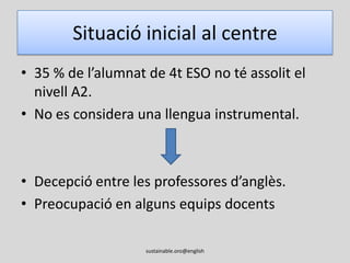 Situació inicial alcentre35 % de l’alumnat de 4t ESO no té assolit el nivell A2.No es considera una llengua instrumental.Decepció entre les professores d’anglès.Preocupació en alguns equips docentssustainable.oro@english