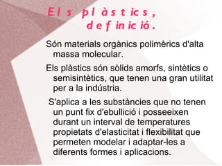 Els plàstics sónsòlids amorfs, sintètics o semisintètics, que tenen una gran utilitat per a la indústria.