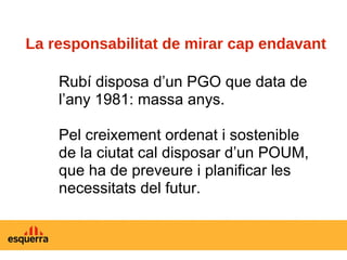 La responsabilitat demirar cap endavant Rubí disposa d’un PGO que data de l’any 1981: massa anys. Pel creixement ordenat i sostenible de la ciutat cal disposar d’un POUM, que ha de preveure i planificar les necessitats del futur.