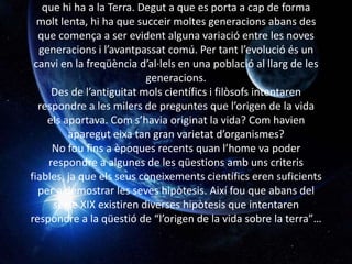 L’evolució biològica ésel conjunt de transformacions i canvis a través del temps que origina tota la diversitat d’espècies que hi ha a la Terra. Degut a que es porta a cap de forma molt lenta, hi ha que succeir moltes generacions abans des que comença a ser evident alguna variació entre les noves generacions i l’avantpassat comú. Per tant l’evolució és un canvi en la freqüència d’al·lels en una població al llarg de les generacions.Des de l’antiguitat mols científics i filòsofs intentaren respondre a les milers de preguntes que l’origen de la vida els aportava. Com s’havia originat la vida? Com havien aparegut eixa tan gran varietat d’organismes?No fou fins a èpoques recents quan l’home va poder respondre a algunes de les qüestions amb uns criteris fiables, ja que els seus coneixements científics eren suficients per a demostrar les seves hipòtesis. Així fou que abans del segle XIX existiren diverses hipòtesis que intentaren respondre a la qüestió de “l’origen de la vida sobre la terra”…