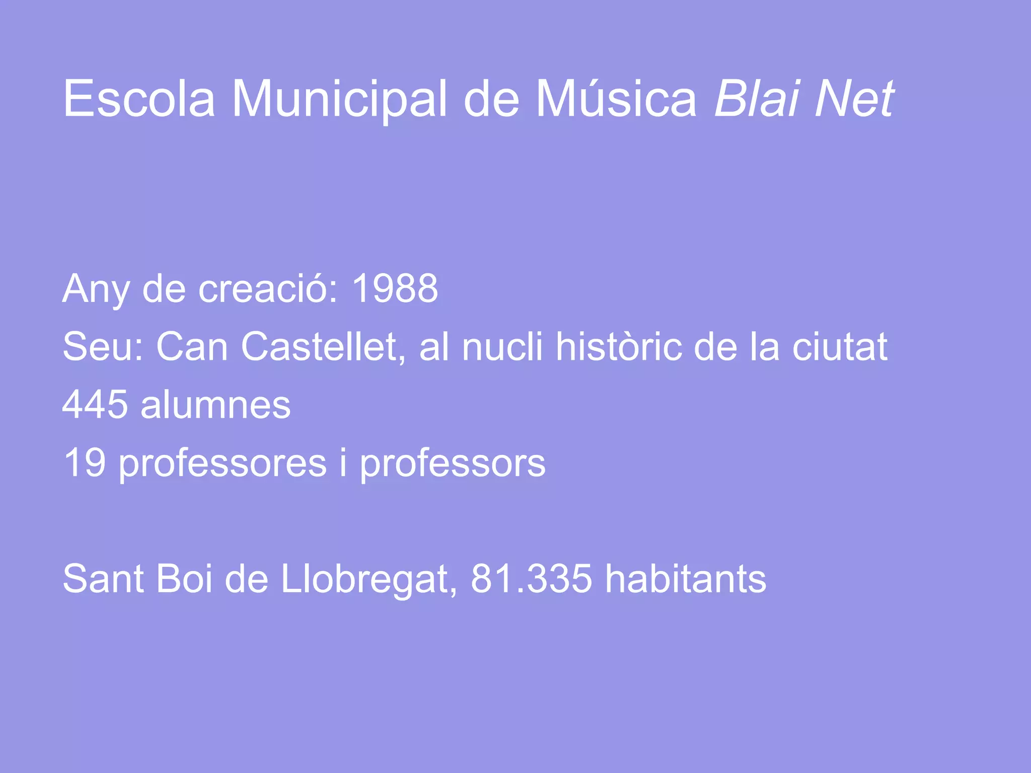 Escola Municipal deMúsica Blai Net Any de creació: 1988 Seu: Can Castellet, al nucli històric de la ciutat 445 alumnes 19 professores i professors Sant Boi de Llobregat, 81.335 habitants