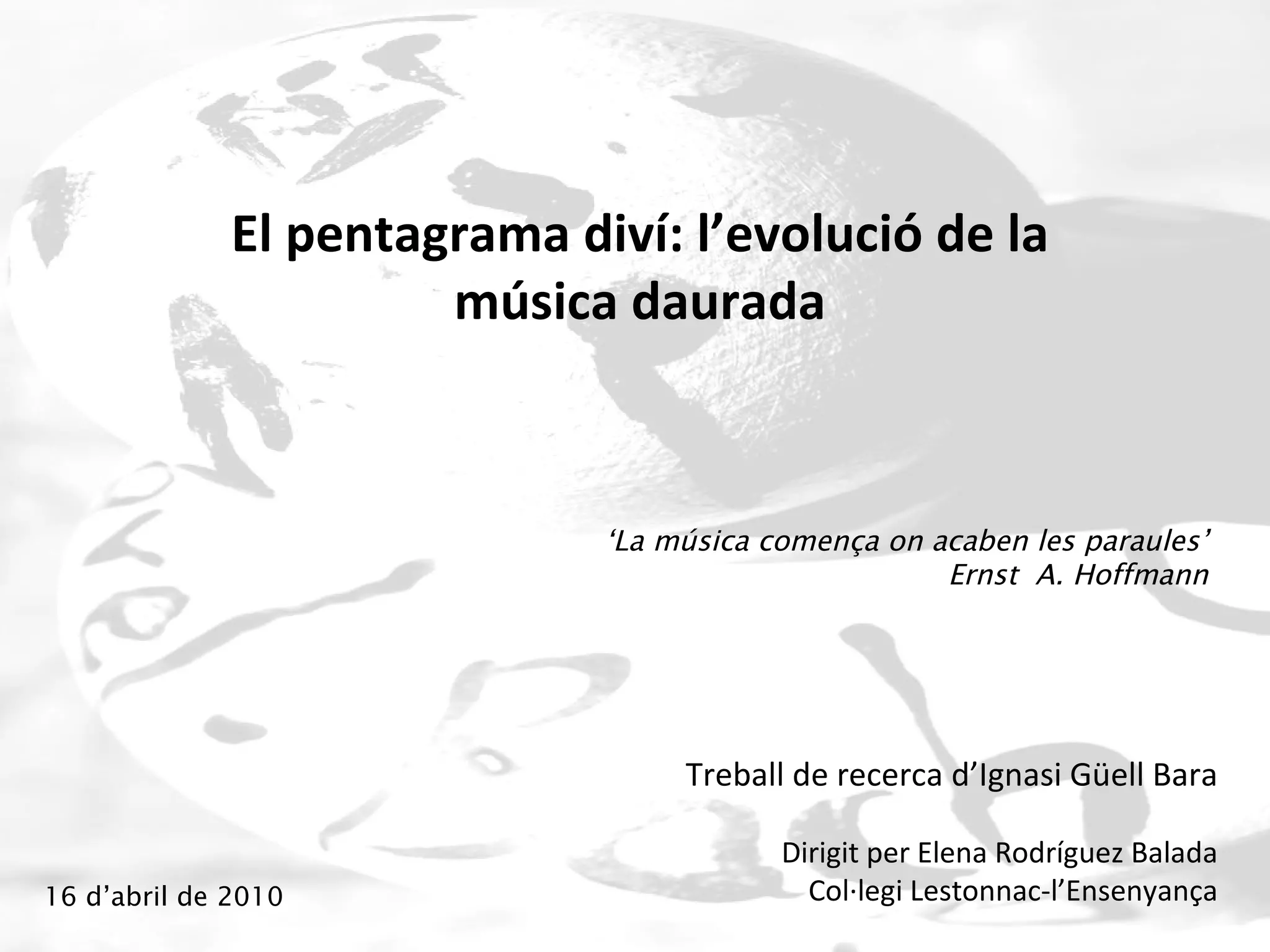 Treball de Recercad’Ignasi Güell Bara 2n de Batxillerat El pentagrama diví: l’evolució de la música daurada Treball de recerca d’Ignasi Güell Bara Dirigit per Elena Rodríguez Balada Col·legi Lestonnac-l’Ensenyança ‘ La música comença on acaben les paraules’ Ernst A. Hoffmann 16 d’abril de 2010