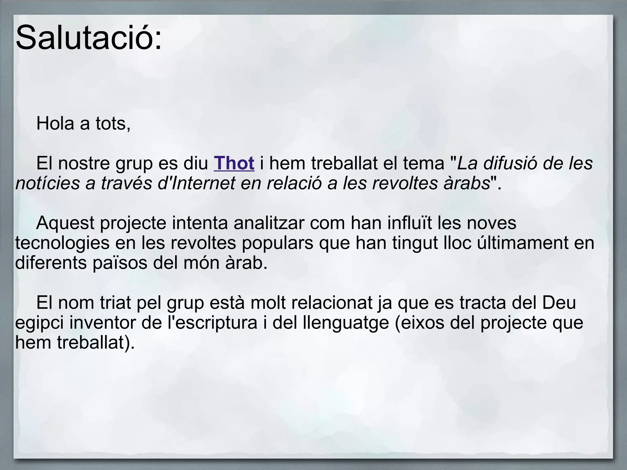 Salutació: Holaa tots, El nostre grup es diu Thot i hem treballat el tema " La difusió de les notícies a través d'Internet en relació a les revoltes àrabs ". Aquest projecte intenta analitzar com han influït les noves tecnologies en les revoltes populars que han tingut lloc últimament en diferents països del món àrab. El nom triat pel grup està molt relacionat ja que es tracta del Deu egipci inventor de l'escriptura i del llenguatge (eixos del projecte que hem treballat).
