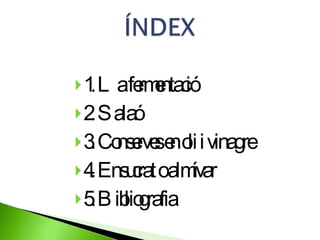 1. La fermentació2. Salaó 3. Conserves en oli i vinagre 4. Ensucrat o almívar 5. Bibliografia