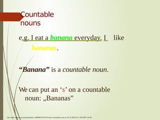 The document is a presentation on countable and uncountable nouns, including definitions and examples of each type. Countable nouns can be singular or plural and can be counted (e.g., 'banana' and 'bananas'), while uncountable nouns only have one form and cannot be counted (e.g., 'rice'). The document provides specific examples to illustrate these concepts.