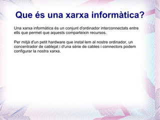 Que és unaxarxa informàtica? Una xarxa informàtica és un conjunt d'ordinador interconnectats entre ells que permet que aquests comparteixin recursos. Per mitjà d'un petit hardware que instal·lem al nostre ordinador, un concentrador de cablejat i d'una sèrie de cables i connectors podem configurar la nostra xarxa.