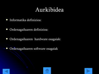 Ordenagailuearen Hadware osagaiakCPU: Ordenagailuaren zerebro gidaria, egin beharreko guztia gidatzen duen organo eraginkorra pentium, AMD. Bere gaitazuna nola adierazten da: Mhz adieraazten den abiadura (haizegailu beharrezkoa) Era berean tratatu ditzaken bit kopuru (32 bit pentium, 64 nintendo…) (hitzaren luzera, WORD)