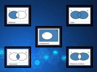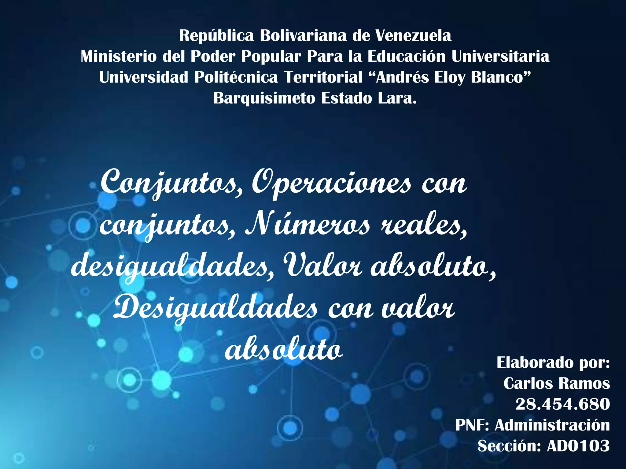 El documento trata sobre conceptos fundamentales de conjuntos y operaciones con ellos, así como de números reales y desigualdades. Se describen operaciones básicas como unión, intersección y diferencia, junto con la notación correspondiente y ejemplos. Además, se abordan desigualdades simples y de valor absoluto, explicando su resolución y representación gráfica.