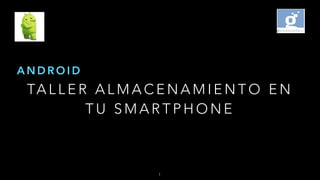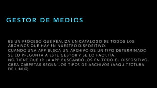 El documento describe cómo gestionar archivos en un smartphone y Android, enfocándose en el almacenamiento positivo de archivos. Se menciona que se puede facilitar el acceso a un tipo específico de archivo a través de una aplicación y que hay opciones para administrar el almacenamiento interno y de tarjeta SD. Además, advierte sobre la posibilidad de perder información si no se configura correctamente el almacenamiento.