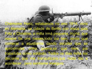 Chámome Hanz, estabamosno ano 1914, vivía en Alemaña, na cidade de Berlín con meus pais Fritz e Christine, e miña irmá pequena, Ingrid, que nacera fai uns meses,todo iba ben, ainda que comecei a asustarme cando escoitei que se aproximaba unha guerra,xa que meu pai traballaba como soldado. Todos os días miña nai decíame que me tranquilizara,que nada iba a acontecer , pero sentíame inseguro.