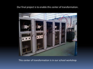 The document summarizes a student group's final project to enable the transformation center at their school workshop. It includes an index of topics: parts of a transformation center including line cells, a sectionalizer cell, protection cell, measuring cell, transformer, and low voltage box. It then describes the mounting process of connecting and installing these components. Finally, it discusses safety measures for working in a transformation center including protective equipment and signage.