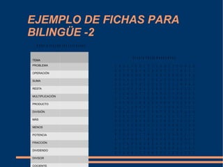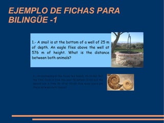 This document contains examples of bilingual flashcards and word searches in Spanish and English. The flashcards include math word problems, such as calculating the distance between an animal in a well and one flying above. The word searches contain math and geometry terms in Spanish like problema, suma, and teorema de Pitágoras. The document demonstrates bilingual learning materials for students.