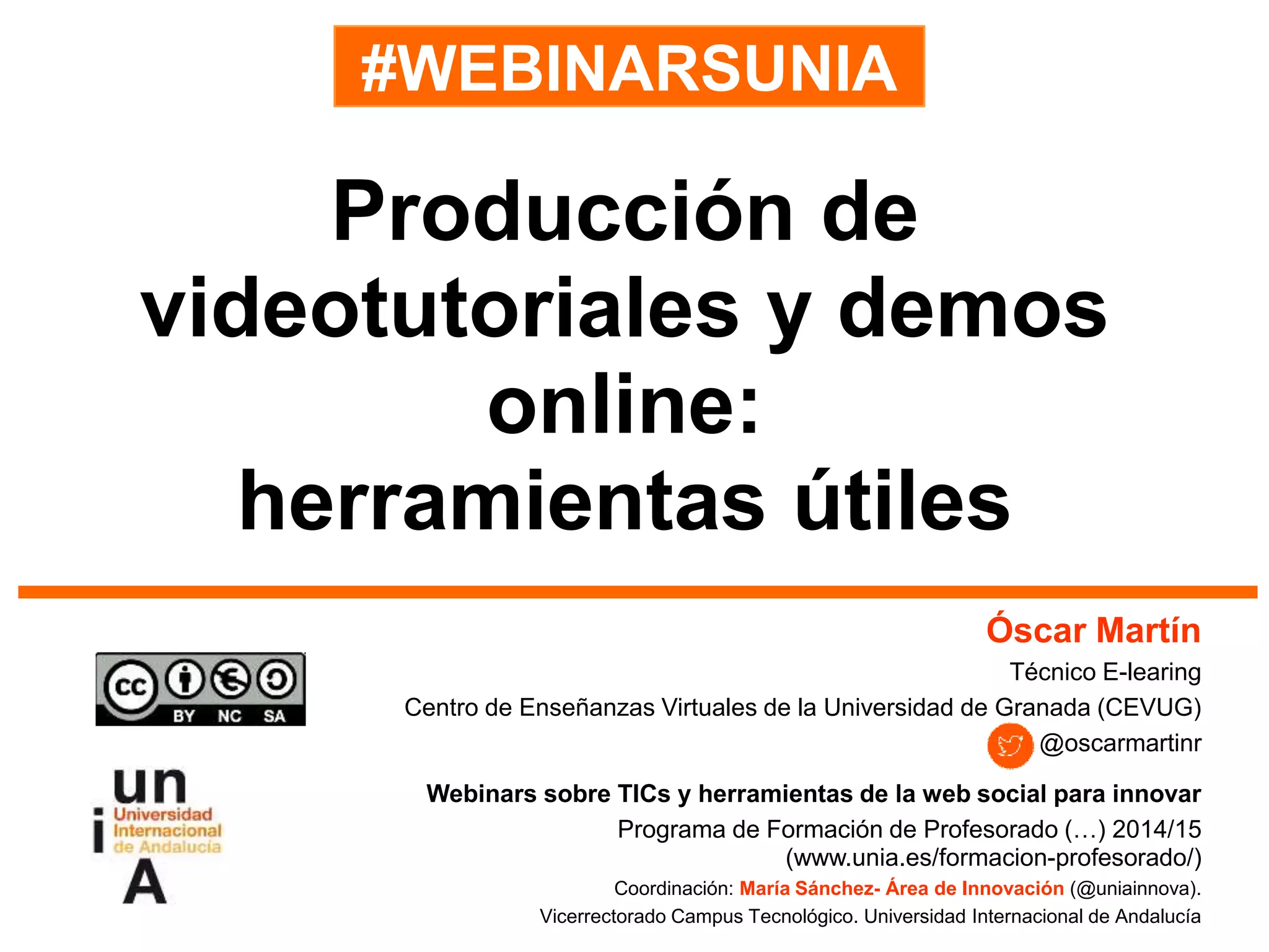 El documento proporciona información sobre herramientas y software para la creación de videotutoriales y screencasts, destacando opciones gratuitas y su funcionalidad. Se mencionan diferentes tipos de herramientas como Camstudio, Jing, y Screencast-O-Matic, junto con descripciones de sus características. Además, se explican términos relacionados como podcast, videocast y streaming.