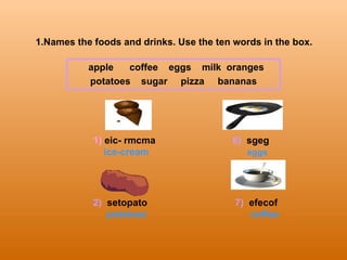 1. It lists 10 common foods and drinks: coffee, eggs, potatoes, oranges, bananas, milk, sugar, pizza, apple, and hamburguer.