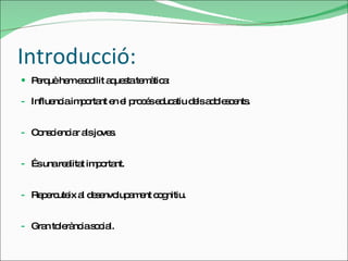 Introducció: Perquè hemescollit aquesta temàtica: Influencia important en el procés educatiu dels adolescents. Conscienciar als joves. És una realitat important. Repercuteix al desenvolupament cognitiu. Gran tolerància social.