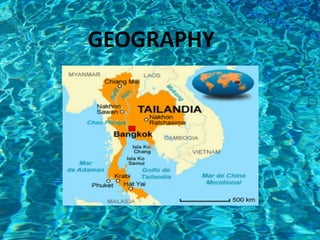 Thailand has a diverse landscape and culture. Its capital and largest city is Bangkok, and popular places to visit also include Krabi. The country's cuisine features dishes like pad Thai and lap mu. Buddhism is practiced by 95% of the population, with the remaining 5% following other religions. The main language is Thai, spoken by 80% of residents, while 20% speak minority languages including Lahu, Lisu, Mon, Malay, and Karen.