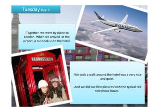 The document provides a summary of a student's trip to London over 9 days. Some of the key places visited included Hyde Park, the Science Museum, Natural History Museum, Harrods, Buckingham Palace, Trafalgar Square, the British Museum, Westminster Abbey, and Portobello Road. Various activities were done like seeing museum exhibits, watching a 4D film, shopping, seeing the changing of the guard, and bowling before returning home to Valladolid.