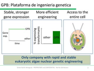 1) Green Pacific Biologicals has developed a genetic engineering platform that enables more stable and efficient nuclear gene expression in eukaryotic algae.