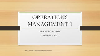 This document discusses different process strategies used in operations management. It describes process focus strategy as organizing facilities around specific processes to enable low-volume, high-variety production using general purpose equipment. Key aspects of process focus strategy include high product flexibility but also high costs and difficulties with production planning. The document contrasts process focus with repetitive focus, product focus, and mass customization strategies.