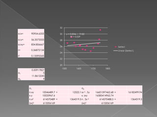 This document contains a table of 15 data points measuring x, y, x^2, y^2, and xy values. It then performs linear regression analysis to find the line of best fit between x and y. The linear regression equation is y = 0.004x + 19.82 with an R^2 value of 0.029, indicating a weak correlation between x and y.