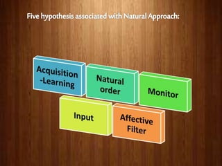 The document summarizes the Natural Approach, a philosophy of language teaching developed by Tracy Terrel and Stephen Krashen in the 1970s-1980s. It focuses on developing communicative competence through comprehensible input, using activities that enhance acquisition. The teacher emphasizes listening initially and allows for natural stages of speech production, without forcing early speech. The affective filter is important to help lower students' anxiety levels. The approach was later associated with more traditional methods but focused on principles of natural language acquisition.