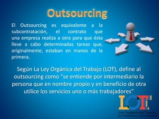 El documento define el outsourcing como la contratación de una empresa para que realice tareas específicas que originalmente estaban a cargo de otra empresa. Explica que el outsourcing puede reducir costos pero también conlleva riesgos como una reducción insuficiente de costos o problemas con el servicio brindado por la empresa contratada. Finalmente, enumera algunas ventajas como enfocarse en la actividad principal y acceder a nuevas tecnologías, y desventajas como afectar la imagen de la empresa si el servicio es deficiente.