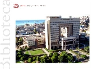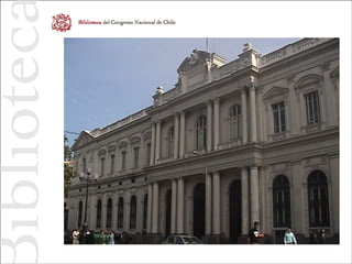The Library of National Congress is a library founded 120 years ago to provide support for the National Congress of Chile. It contains over 200,000 objects including books, periodicals, and databases. The library provides several services to congresspeople and the public including access to Chilean laws, histories of congresspeople, and territorial information systems. The head of the new Digital Services department is working to modernize technology, improve processes, and shift the library's focus to better serve the needs and concerns of clients, especially congresspeople.