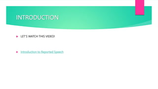This document provides an overview of reported speech, also known as indirect speech. It explains that reported speech is used to tell someone what another person said without using their exact words. Examples are given of changing direct quotes into indirect reported statements and questions by modifying pronouns, verbs, and time/place expressions. Common reporting verbs like say, tell, ask are discussed. The document concludes with exercises to practice changing direct speech into reported speech.