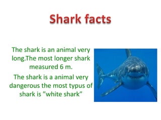 The shark is a very long animal that can reach 6 meters in length. Sharks are dangerous carnivores that eat fish and dolphins, and in some cases will even eat other sharks like white sharks eating tiger sharks. Sharks are mainly found in warm waters and many live off the coast of Mexico, with their locations now able to be tracked via satellite.