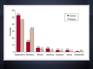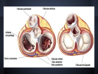 Cardiac valvulopathy is a condition where the heart valves become inflamed and stiff, preventing them from closing properly and allowing blood to flow backwards. The valves can be damaged by infections, injuries, aging, or previously by rheumatic fever. The most common type is degenerative valvulopathy in elderly patients as the valves harden and lose mobility over time. Valvulopathy is classified as light, moderate, or severe depending on the level of affection and whether treatment or surgery is needed. The main valves that can be affected are the mitral, aortic, pulmonary, and tricuspid valves. Symptoms depend on increased pressure in the heart chambers and the heart's ability to pump blood effectively.