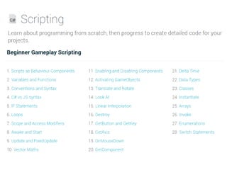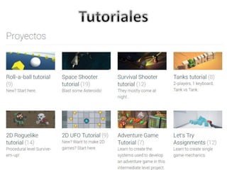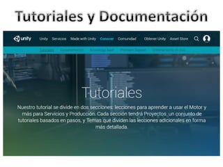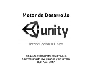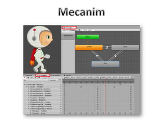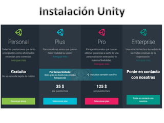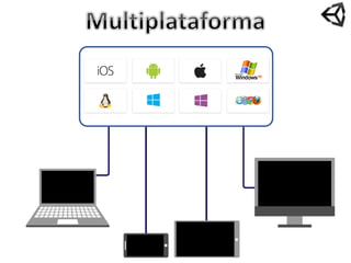 Unity is a multi-platform game engine that can be used to develop 3D games. It provides tools for creating 3D environments and objects, animations, physics, lighting and rendering effects. Developers can use scripting languages like C# to program logic and interactions. Unity supports exporting games to many platforms including web, mobile, consoles and VR/AR. It includes an integrated development environment and asset store of reusable components.