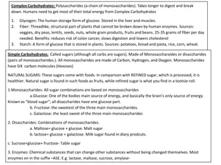 Complex carbohydrates are polysaccharides made of long chains of monosaccharides that take longer to digest. Humans need to get most of their energy from complex carbs like glycogen, fiber, and starch. Simple carbs are sugars made of single or double monosaccharides and include natural sugars from fruits as well as refined sugars. Carbs are digested through enzymes in saliva and the small intestine that break them down into monosaccharides, which are then absorbed and used for energy or storage.