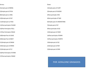 This document contains a crossword puzzle with simple past and past participle verb forms to fill in across and down clues. There are 27 clues total asking for verbs like "brought", "hurt", "chose", "been", and others in their simple past or past participle forms to complete the puzzle. The puzzle was created by Geraldine Granados.