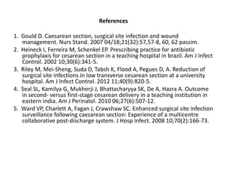 This document contains 5 references related to caesarean section procedures and surgical site infections. The references discuss antibiotic prophylaxis for c-sections, efforts to reduce surgical site infections in low transverse c-sections, outcomes of first versus second stage c-sections, and post-discharge surgical site infection surveillance following c-sections.