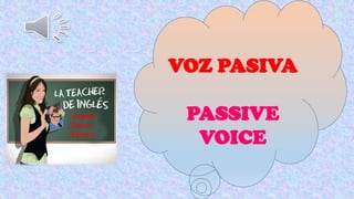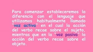 The document discusses the passive voice in Spanish. It begins by distinguishing between the active voice, where the subject performs the action of the verb, and the passive voice, where the action of the verb is received by the object. It then provides instructions for transforming an active sentence into a passive sentence by making the object the subject and using the verb "to be" plus the past participle. Examples are given of active and corresponding passive sentences. Finally, it discusses how the verb changes form depending on its tense in the original active sentence and provides five more examples of sentences transformed from active to passive voice.