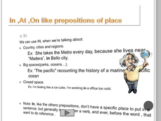 This document discusses the uses of the prepositions "in", "at", and "on" as they relate to place and time. It provides examples of how each preposition is used to indicate location, such as "in" for closed spaces or big areas, "at" for exact addresses or public places, and "on" for things above a surface. It also examines their uses relating to time, with "in" used for months, years, centuries, and parts of the day (except night), "at" for hours and precise times, and "on" for days of the week and dates. Overall, the document serves as a reference for the different ways these common prepositions of place and time are used