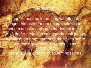 1.Proposta Primer elsnostres tutors ens van dir que al segon trimestre faríem un projecte, i que seriem nosaltres els que tiraríem el tema. Això de fer projectes ens agrada molt ja que treballem en grup, aprenem moltíssim sobre un tema que triem nosaltres, i ens espavilem tots sols ja que tot ho busquem nosaltres.