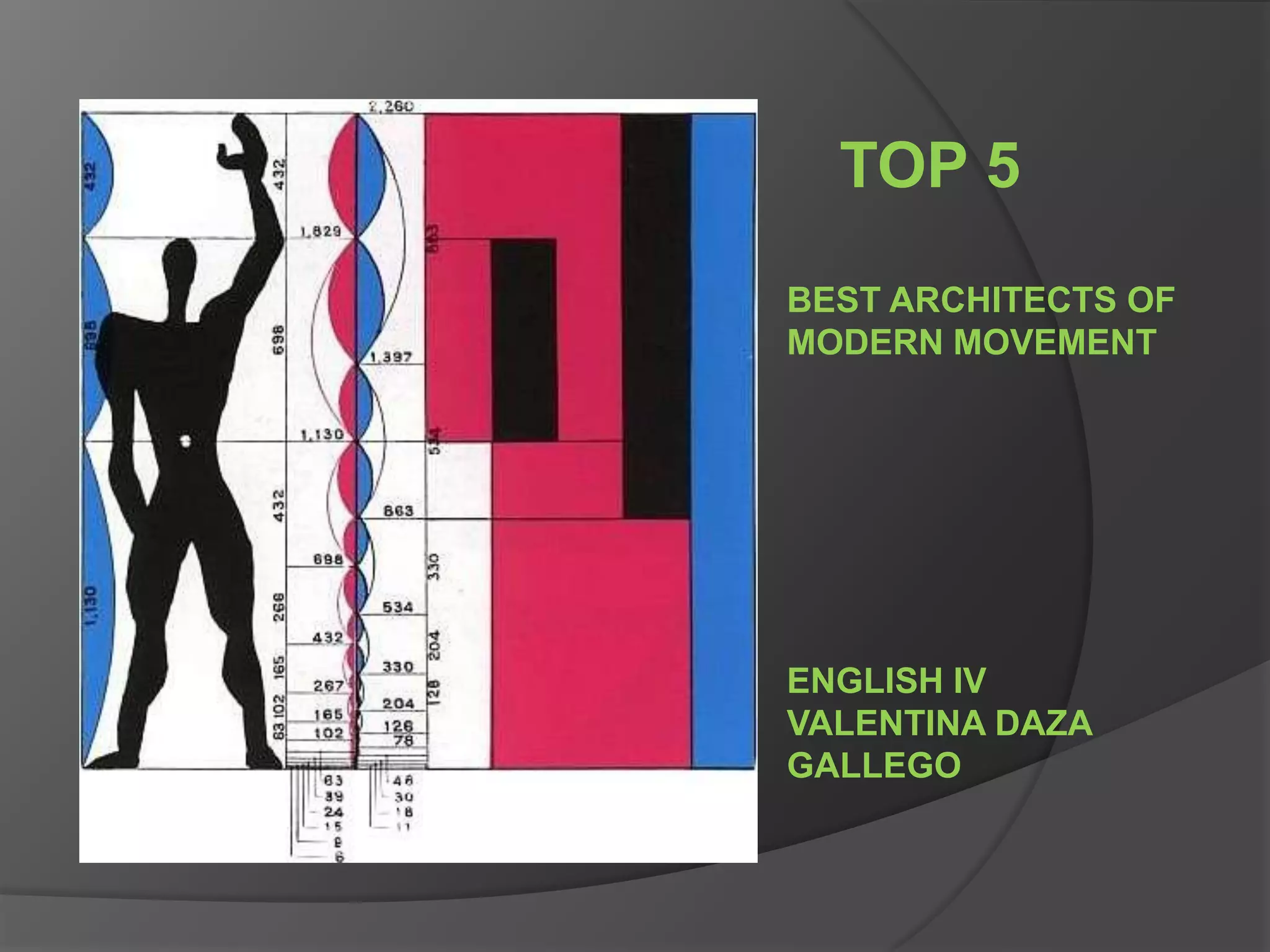 The document summarizes the top 5 modern architects. It discusses their notable works and contributions to modern architecture. 1) Ludwig Mies van der Rohe was a pioneer of steel and glass structures, designing iconic buildings like the Seagram Building in New York. 2) Oscar Niemeyer was a pioneer of reinforced concrete who designed sweeping organic forms, like the Cathedral of Brasilia. 3) Le Corbusier was an influential theorist who saw architecture as a means to change the world, designing landmark buildings like the Unité d'Habitation. 4) Zaha Hadid was the first woman to win the Pritzker Prize, known for deconstructivist designs like the Contemporary Arts Center in Cincinnati. 5) Frank